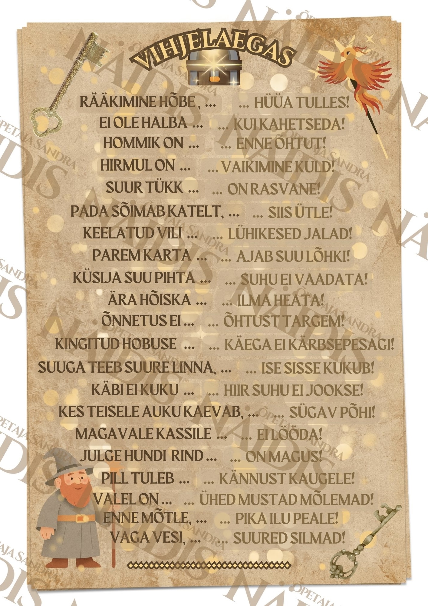 📝 Vanasõnade teema käsitlemiseks meisterdasin õpilastele “Vanasõnade võtmeretke”, mille läbimise käigus tuleb õpilastel proovile panna nii oma teadmised üldtuntud vanasõnadest ja nende tähendusest, nutikus ja keelevaist kui üleüldine silmaring.
