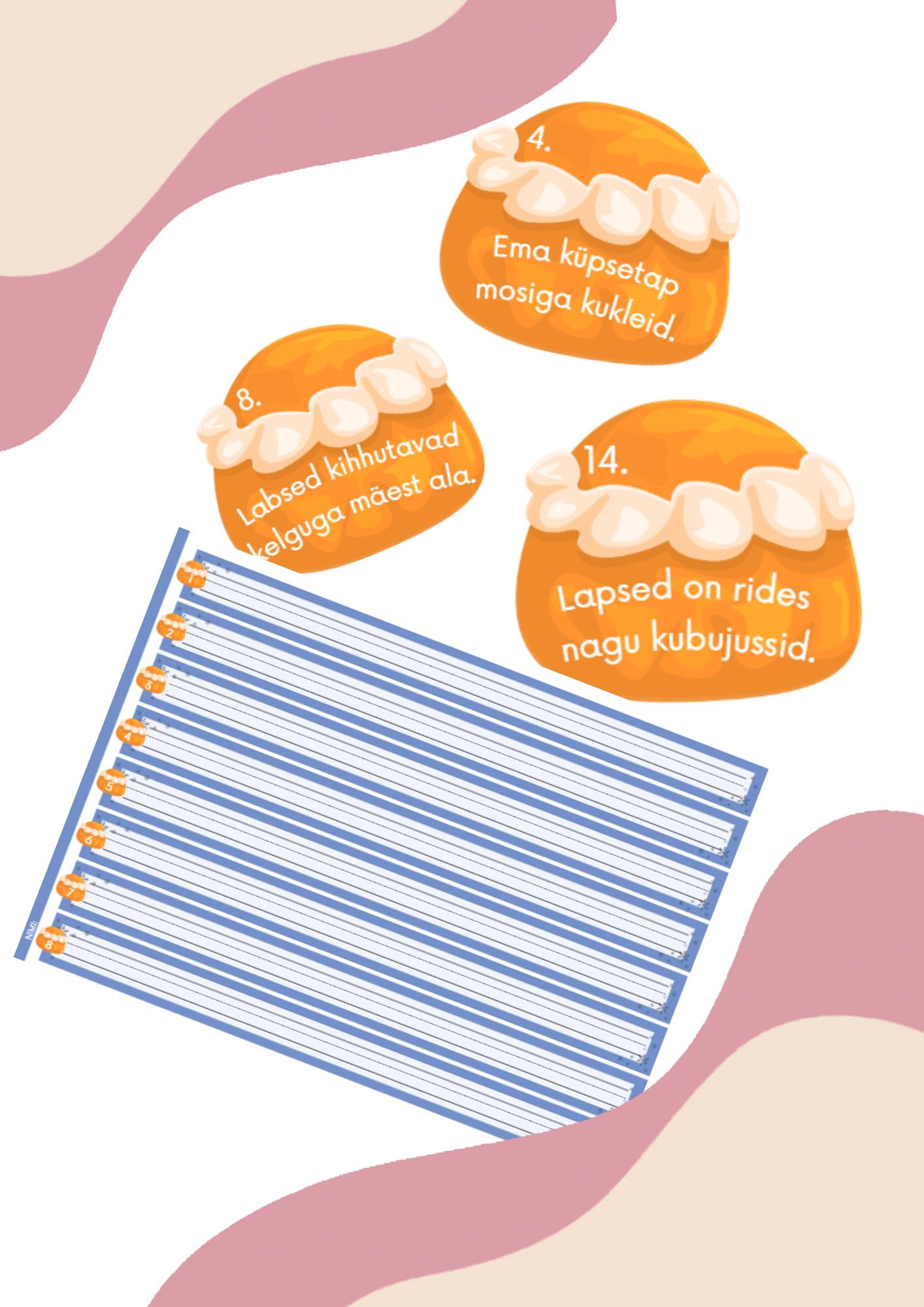 Lastele mõeldud vastustelehel on võimalus kirjutada 16 lauset järjekorra numbri alusel, mis on leida vastlakuklilt. Abijoontega vastusteleht käekirja harjutamiseks!