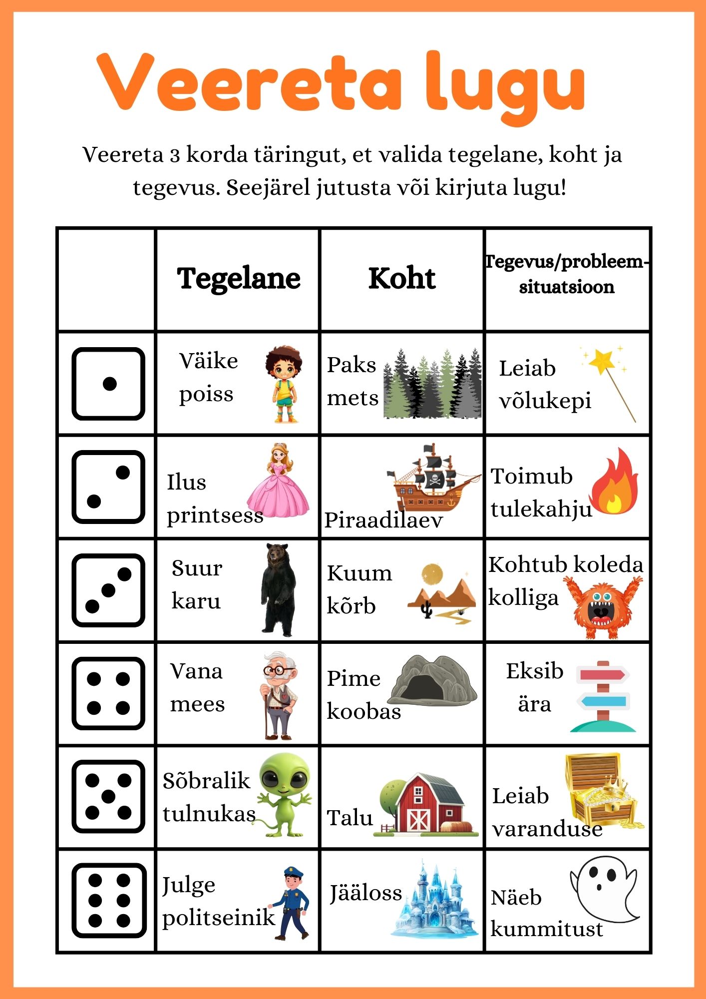 Veereta täringuid, et valida tegelane, koht ja tegevus ning lase fantaasial lennata!