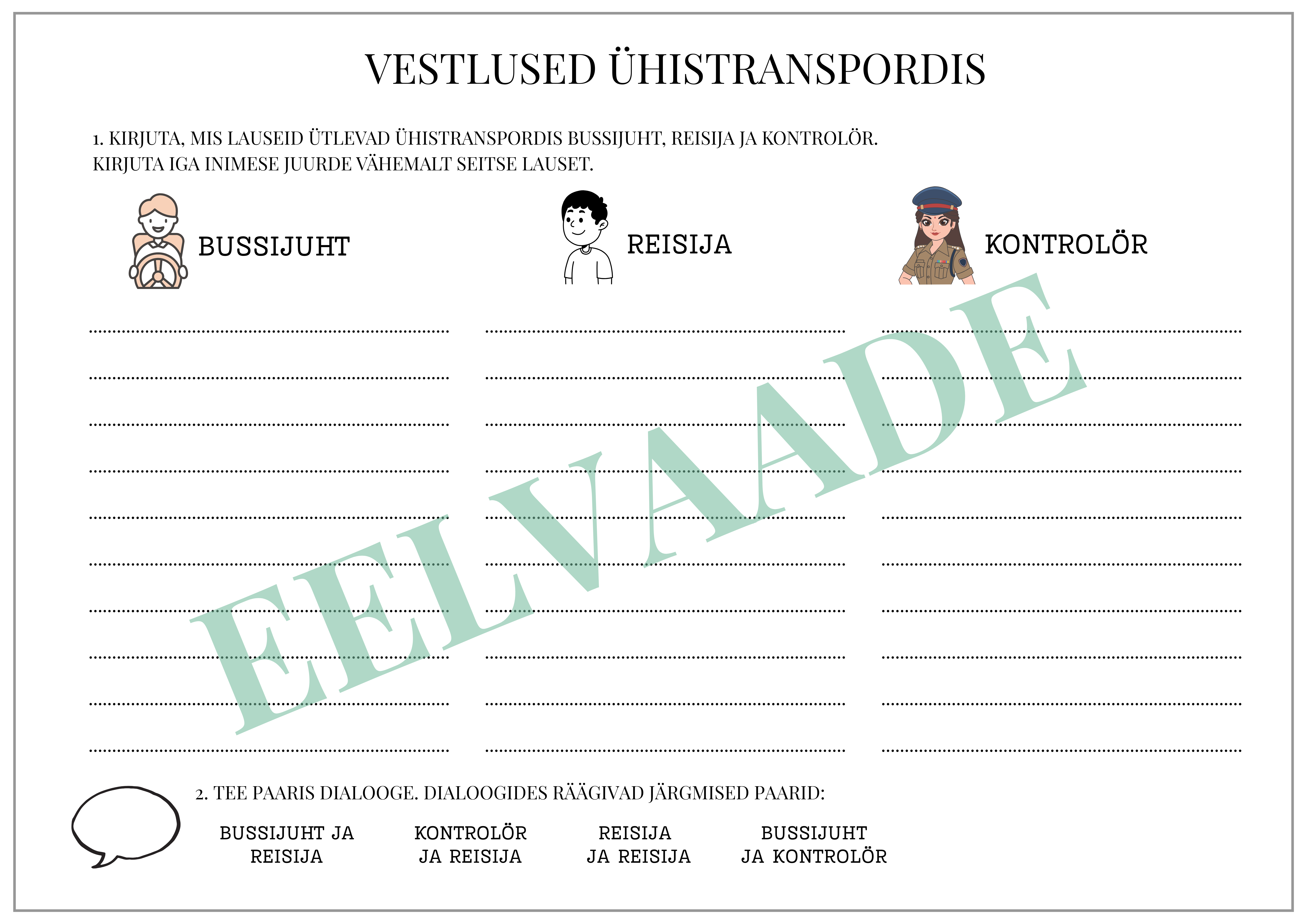 Tööleht ühistranspordis vajalike lausete ja sõnade kordamiseks. Kõigepealt kirjutavad õpilased erinevaid lauseid, mida bussijuht, reisija ja kontrolör bussis räägivad. Seejärel teevad nad paarilisega ühistranspordi dialooge.