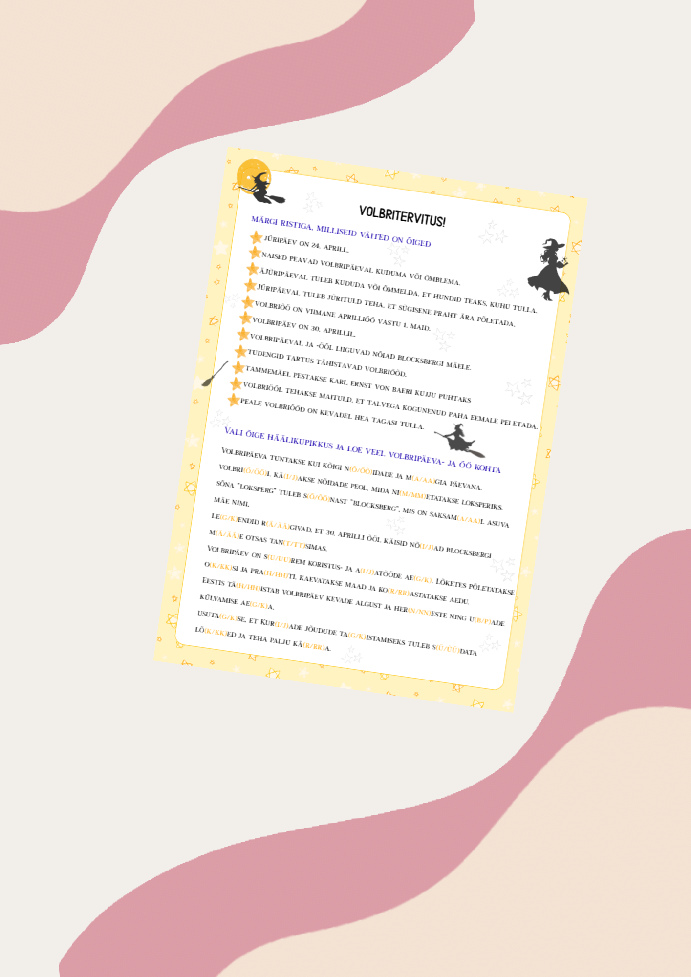 Prindi, loe ja täida tööleht. Toetab funktsionaalset lugemisoskust, häälikuanalüüsioskust ja laiendab teadmisi volbripäevast ning -ööst kui ka jüripäevast.